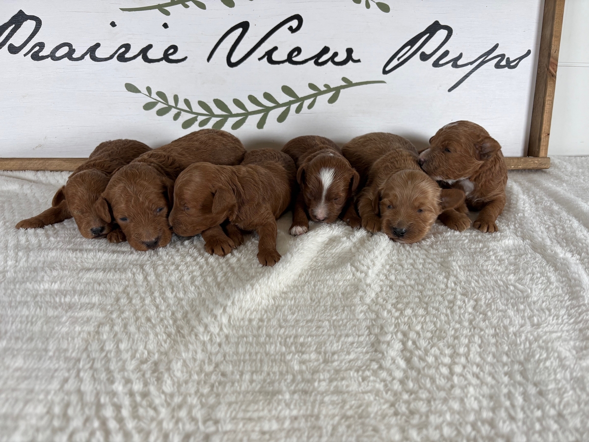 Pups have arrived for Aspen & Cooper! There are 3 females and 4 males . Aspen is a 28lb F1 Miniature Goldendoodle with a relaxed and attentive personality. Cooper is a confident and friendly dark red miniature poodle that weighs 14lbs. Parents are DNA health tested. Puppies will be 20-35lbs when mature! Please contact us for current pricing! When the pups are 5 weeks old the selection of specific puppies will begin. Families are welcome to visit in person for selection is able! We do have air transportation options available for families from farther distances. We have placed pups coast to coast! You can use either Paypal or Venmo to make your $200 deposit and reserve a pup!