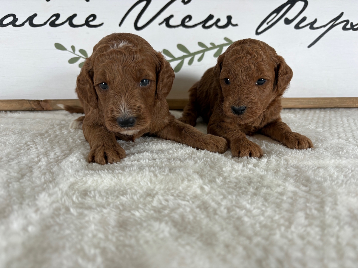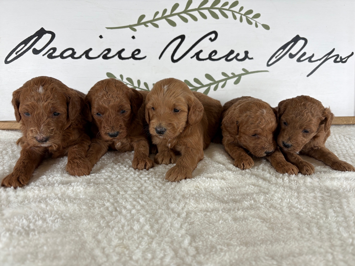 Pups have arrived for Lola & Cooper! We are now accepting deposits for this litter! Lola is a laid back 35lb F1 Mini Goldendoodle with a gentle personality. Cooper is a confident and friendly dark red miniature poodle that weighs 14lbs. Both have been DNA health tested. Pups should mature between 15 & 25 lbs. Since they are F1b they will be smaller and more curly than our F1 puppies. This is a great option if shedding or allergies are a big concern for your family! Please contact us for current pricing! When the pups are 5 weeks old the selection of specific puppies will begin. Families are welcome to visit in person for selection is able! We do have air transportation options available for families from farther distances. We have pups coast to coast! You can use either Paypal or Venmo to make your $200 deposit and be added to the list for a pup from this litter!