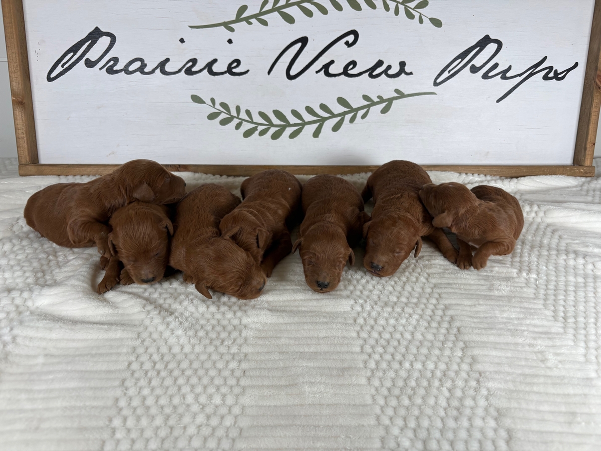 Pups have arrived for Trixie & Tyke! Trixie is an outgoing 55lb Golden Retriever with a playful and friendly personality. Tyke is a confident and friendly dark red miniature poodle that weighs 10lbs. Parents are DNA health tested. Their pups are dark red with some white markings! I expect the puppies to mature between 25-35lbs! Please contact us for current pricing. If you would like to reserve a pup we ask for a $200 deposit. When the pups are 5 weeks old the selection of specific puppies will begin. Families are welcome to visit in person for selection is able! We do have air transportation options available for families from farther distances. We have pups coast to coast! Deposits can be made with the Buy Now PayPal Button or with Venmo!